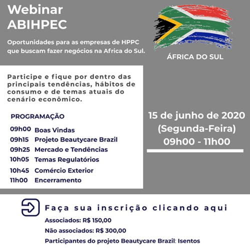 A Associação Brasileira da Indústria de Higiene Pessoal, Perfumaria e Cosméticos (ABIHPEC) e o projeto setorial Beautycare Brazil, organizam um webinar para as empresas brasileiras do setor de HPPC sobre oportunidades de negócios na África do Sul: “Oportunidades para as empresas brasileiras de HPPC que buscam fazer negócios na África do Sul”.