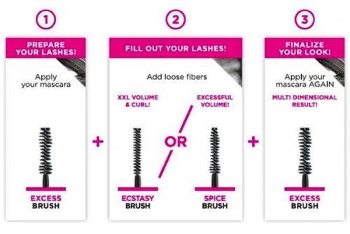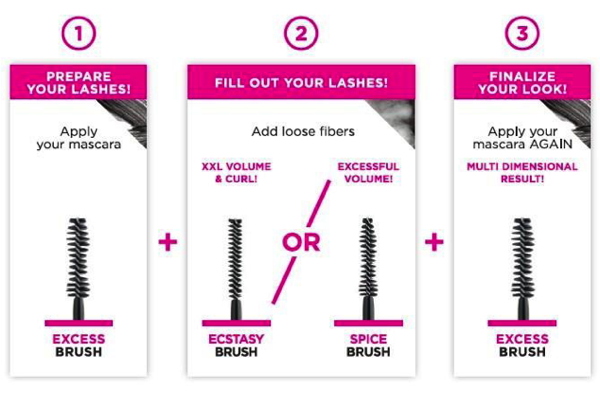 A maquiagem dos olhos é feita em três etapas: aplicação do rímel com a escova Excess; aplicação da fórmula loose fibers com a escova Ecstasy (para curvar e dar mais volume) ou com a escova Spice (para exacerbar o volume); por fim, mais uma aplicação de rímel, a fim de conferir um efeito multidimensional.