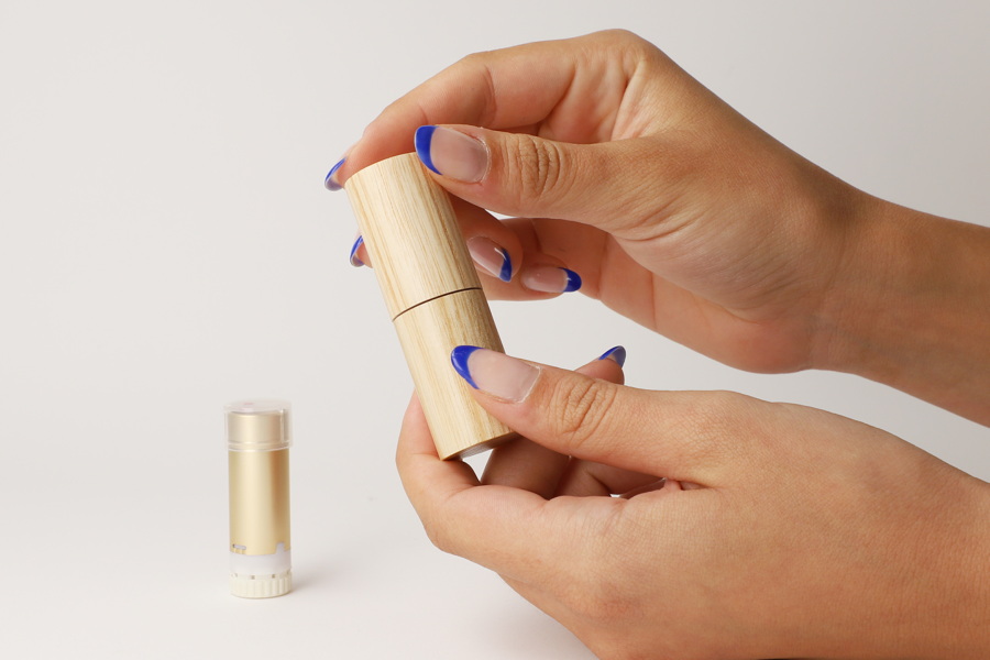 O mecanismo, fixado em um tubo de alumínio, fica posicionado num estojo monomaterial de madeira, desenvolvido e fabricado sob medida pela Quadpack. Produzido inteiramente em madeira de freixo com certificação de manejo florestal sustentável, o estojo abre e fecha com um gesto intuitivo. O sistema patenteado "Solo Twist" tem a forma oval por dentro, garantindo que a tampa possa ser travada automaticamente com apenas um quarto de volta. "O sistema de rotação difere dos fechos de encaixe geralmente presentes nos batons, criando um gesto inédito e divertido", explica a Quadpack em um comunicado.