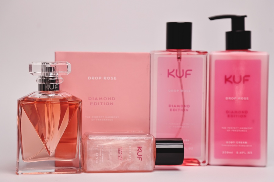 A fragrância Drop Blue traz um toque floral refinado, com notas de topo de marmelo e toranja, notas médias de jacinto e jasmim, e como base envolvente de almíscar, íris, cedro da virgínia e âmbar. Já o Drop Rose aposta em uma assinatura mais doce e envolvente, com topo de mandarina, bergamota e toranja, notas de coração de flor de laranjeira, framboesa, groselha preta e de fundo chantilly, marshmellow, almíscar e ambreta.