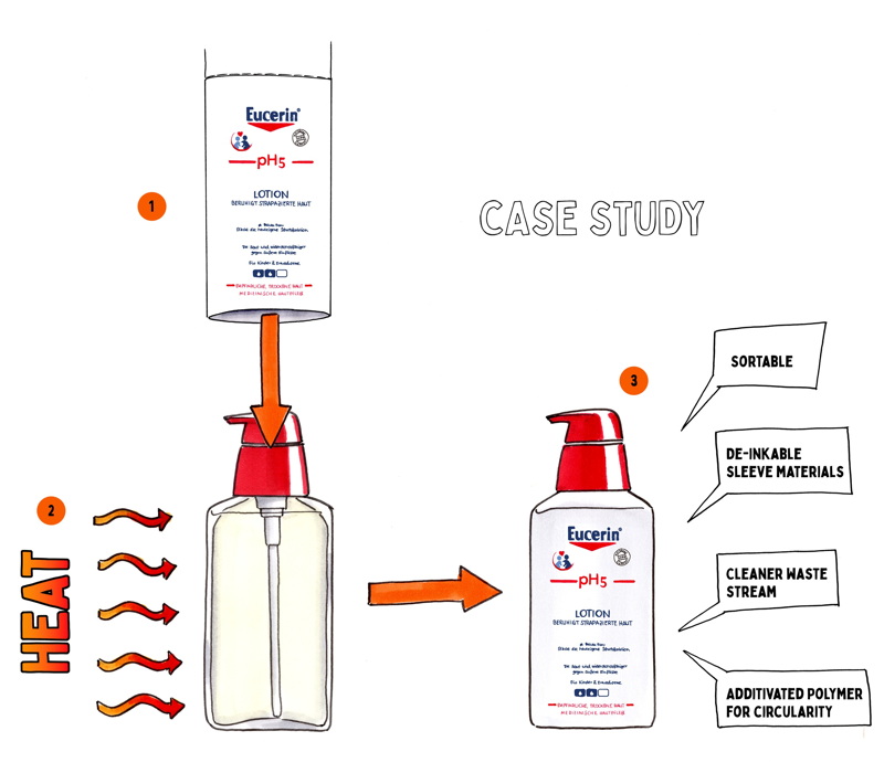 A combinação frasco/manga termorretrátil foi projetada para permitir essa remoção em uma planta de recuperação de materiais. No entanto, para aumentar a circularidade da embalagem, Siegwerk conseguiu fornecer uma composição de tinta projetada para permitir sua remoção.