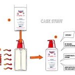 Para satisfazer esses três quesitos, a inovação se concentra em um frasco de poliolefina incolor com 100% de conteúdo PCR [1], inteiramente envelopado com uma manga termorretrátil, impressa com tinta removível.