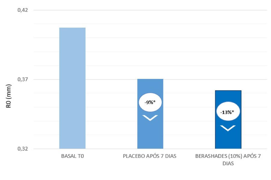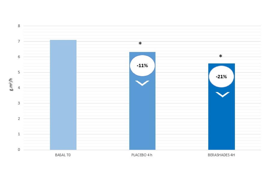A proteção da barreira cutânea fornecida pelo Berashades foi avaliada com um teste TEWL que mostrou uma redução significativa da perda de água transepidérmica, demonstrando a capacidade do ingrediente em garantir a integridade e hidratação da pele.