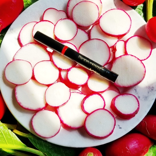 Por isso, o mais recente lançamento da marca é o B. Rouge, um batom vermelho com fórmula 100% plant-based, à base de extrato da casca do rabanete. “Iniciamos o processo de pesquisa e desenvolvimento de produto com esse ativo há 12 anos. Nosso objetivo foi encontrar uma forma de criar maquiagem que não tivesse insetos como principal matéria-prima para o pigmento vermelho ou rosado. Primeiro, criamos o blush à base de rabanete e, depois, o batom matte, a partir de um processo que estabiliza o ingrediente para transformar sua textura, acabamento e aplicação”, afirma a diretora de P&D.