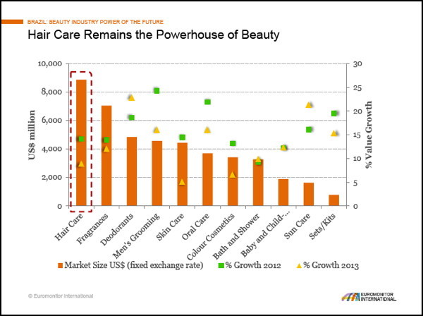 Esse mercado deve registrar um crescimento anual de dois dígitos nos próximos quatro anos, com previsão de atingir 12,45 bilhões de dólares em 2017, segundo a empresa de pesquisas Mintel. Em 2013, xampus e condicionadores representavam um mercado estimado em 2,92 bilhões de dólares. A taxa de utilização de xampu no Brasil figura entre as mais elevadas do mundo: 91% dos brasileiros declaram usar xampu – uma proporção idêntica à da França (91%) e superior à da Inglaterra (89%).