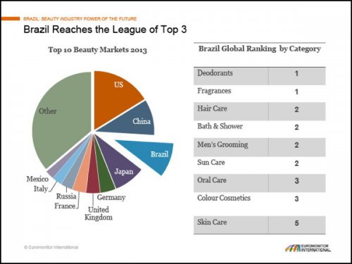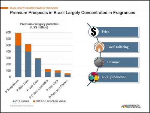 Segundo Euromonitor, o mercado brasileiro ainda é dominado por produtos populares, mas progressivamente a tendência aponta para a crescente importância do segmento premium, graças, em particular, ao aumento das vendas de perfumes e produtos para pele.