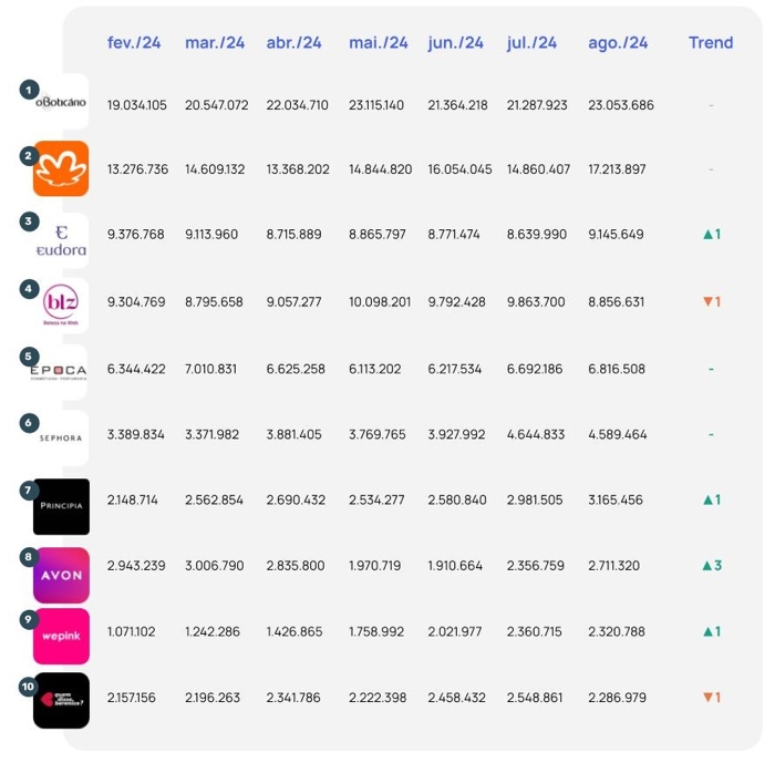 No entanto, o maior crescimento MoM está com sua concorrente, a também gigante brasileira Natura. Com 16% de expansão em agosto, a marca se consolida na segunda posição do ranking do setor, registrando 17,2 milhões de visitantes únicos. O mais alto avanço entre abril e agosto também se estabelece com ela, ao conquistar 3,8 milhões de novos acessos - seu progresso foi de 28,7%.