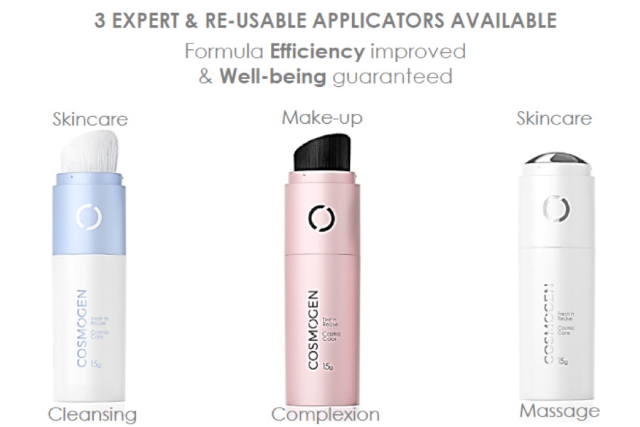 Para completar, a Cosmogen desenvolveu aplicadores móveis e laváveis que podem ser instalados na parte superior do bastão ReUse.