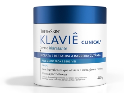 Há 25 anos no mercado, a farmacêutica brasileira TheraSkin, especialista em cuidados com a pele, acaba de lançar uma nova apresentação do Creme Hidratante Klaviê Clinical. O produto, que age na restauração da barreira cutânea hidratando e protegendo a pele, passa a ser comercializado na versão pote, com 440 gramas.
