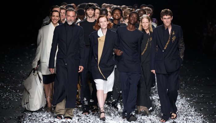 Foi o 150º desfile do estilista, que se distinguiu ao longo de sua carreira pelos ternos cortados de forma impecável, pela audácia na escolha dos materiais, por um universo próprio e poético. Para esta ocasião, Van Noten exibiu tops em organza, silhuetas quase flutuantes, transparências. Seu último modelo desta coleção para a primavera-verão 2025 foi de um homem totalmente vestido de dourado, com um longo casaco preto até os pés.