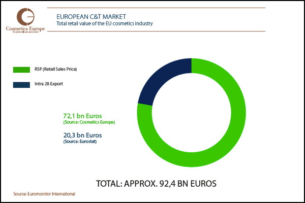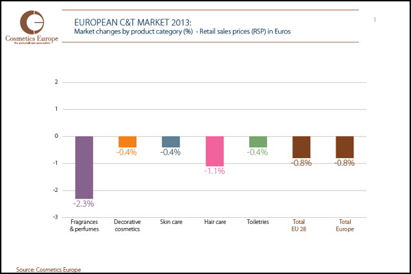 Em 2013, as vendas do setor de produtos cosméticos diminuíram na Europa, perdendo 0,8% em relação ao ano anterior. O total das vendas nos 28 Estados membros da União Europeia, somadas às da Noruega e Suíça, representou 72 bilhões de euros em 2013. Na Espanha e na Grécia, as vendas registraram queda de 3,6%; na Itália, o recuo foi de 1,2%, enquanto, na França, foi de 0,4%. Em compensação, o mercado alemão registrou crescimento de 0,6%.