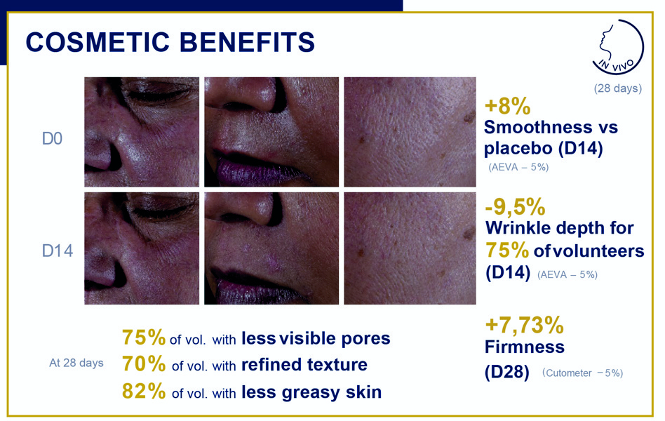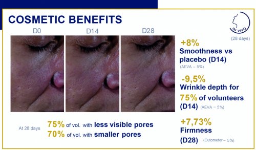 Após 28 dias de utilização, 75% dos voluntários (testes clínicos) apresentaram menor quantidade de poros visíveis, e 70% observaram uma diminuição no diâmetro.