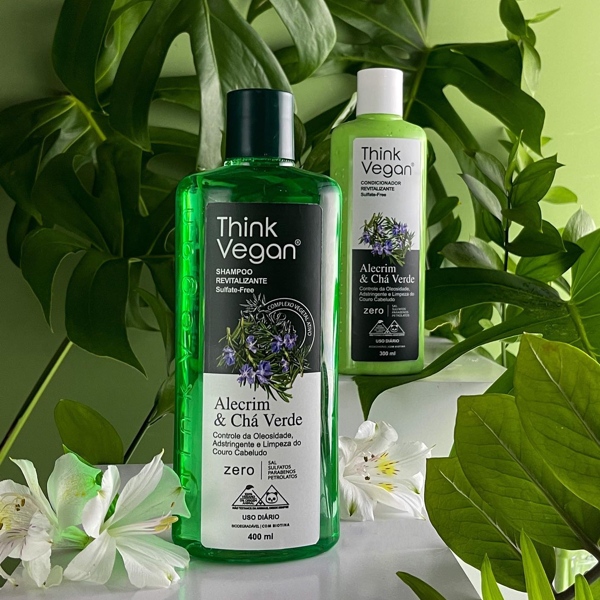Os shampoos e condicionadores da Think Vegan utilizam frascos PET com pigmentos biodegradáveis. Já as bisnagas das máscaras capilares são de resina plástica I´m Green™, da Braskem, um polietileno que tem a cana-de-açúcar como matéria-prima, altamente renovável.