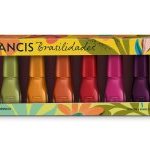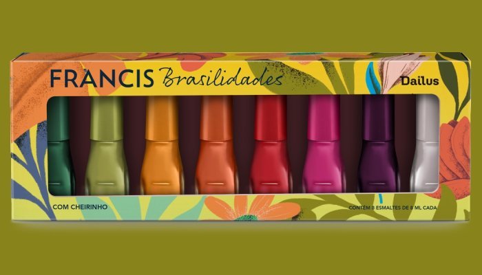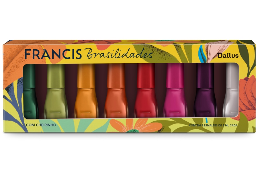 Em parceria inédita com a marca de cosméticos Dailus, a fabricante de sabonetes e produtos para a pele que pertencente a grupo Flora, criou um kit exclusivo, com 8 esmaltes, que correspondem às cores e fragrâncias da nova linha Francis Brasilidades. Com toque tropical, as versões são: Água de Coco, Capim Limão, Carambola, Manga Rosa, Graviola, Acerola, Amora e Lima Doce. Os esmaltes têm os mesmos nomes dos sabonetes.