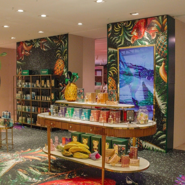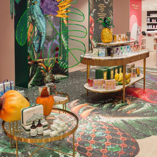 As boutiques pop-up têm cenografia inspirada na exuberância tropical brasileira, com vegetação, elementos exóticos e fragrâncias icônicas da marca, destacando o compromisso da Granado com ingredientes naturais e o estilo de vida vibrante do Brasil.