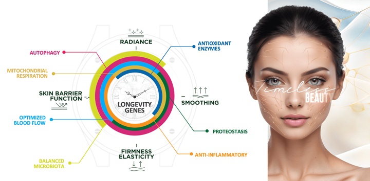 A nível celular, a longevidade pode ser definida como a manutenção do funcionamento ideal das células da pele ao longo do tempo para preservar as características que demosntram sua saúde (radiância, suavidade, elasticidade). Os genes de longevidade SIRT6 e FOXO3 (genes superexpressos em centenários) desempenham um papel importante nas vias de sinalização de longevidade. SIRT6 ativa o gene FOXO3, que aciona a atividade mitocondrial da célula e o processo de autofagia. SIRT6 também ativa o NrF2 (que inibe o estresse oxidativo) e reduz a inflamação crônica ao inibir o NfkB.