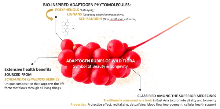 Ao investigar estes diferentes mecanismos e identificar quais as moléculas que os afetam positivamente, a Greentech desenvolveu o seu novo princípio activo: Timelys®, concentrado em Schisandrina. A grande família dos polifenóis possui propriedades antienvelhecimento, nomeadamente através da sua ação nos marcadores de envelhecimento, levando a Greentech a apostar neles. Após investigação intensiva, a Greentech visou especificamente os lignanas, uma categoria menos representada entre os polifenóis, capaz de aumentar a esperança de vida. Isso levou a Greentech à pesquisar a Schisandra chinensis, rica em Schisandrina e conhecida como uma fruta que contém uma composição riquíssima e que contribui para a saúde por toda vida.