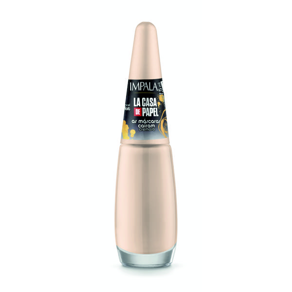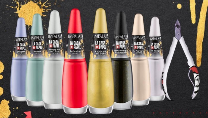 Os fãs da produção poderão encontrar oito cores que transmitem a personalidade dos personagens em suas falas marcantes, os acontecimentos e a realidade dos cenários da série, como: “Bella Ciao” (vermelho vibrante), “Que Comece o Matriarcado” (preto intenso com partículas douradas), “É Mais que Um Golpe” (dourado com pequenos pontos de ouro), “Sempre tem um plano” (Cinza neutro), “As máscaras caíram” (Nude), “Tudo pode desmoronar” (azul arroxeado), “Fim de jogo” (branco óptico) e “Alcatraz” (Verde acinzentado). Preço sugerido para cada esmalte da coleção Impala La Casa de Papel: R$ 5,90.