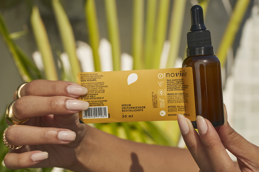 Uma solução simples, mas de impacto, foi pensada pela Noviole. Com o lema de “mais produto, menos lixo”, a marca de clean beauty adotou o uso do “rótulo-bula”, que permite a inserção das informações sobre composição, modo de uso, precauções e validade diretamente na embalagem primária do produto, dispensando as bulas tradicionais e mesmo as embalagens secundárias.