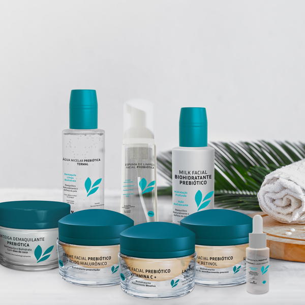 O portfólio de cuidados com a pele é 100% desenvolvido com prebióticos, substânciasresponsáveis por estimular a produção de “bactérias do bem” e manter o equilíbrio da microbiota da pele.