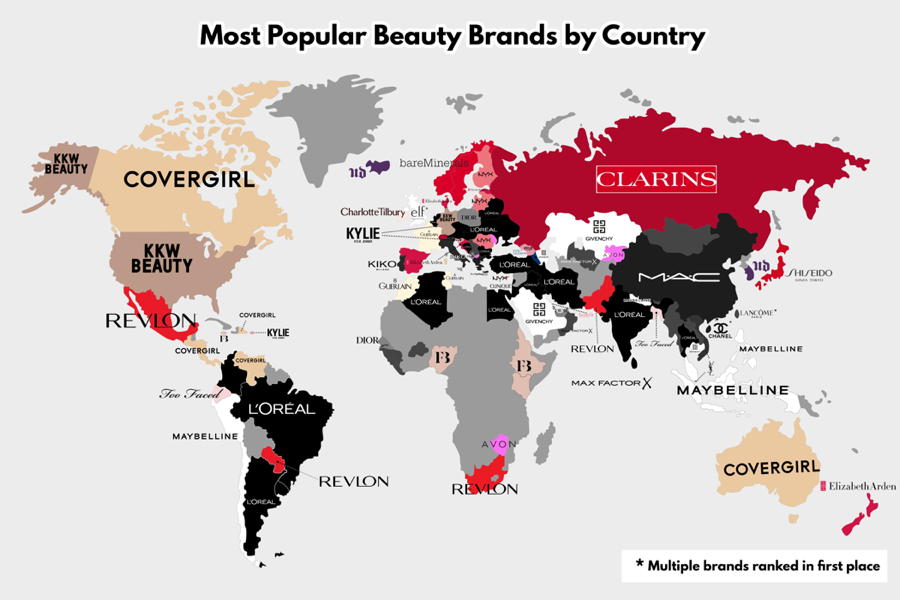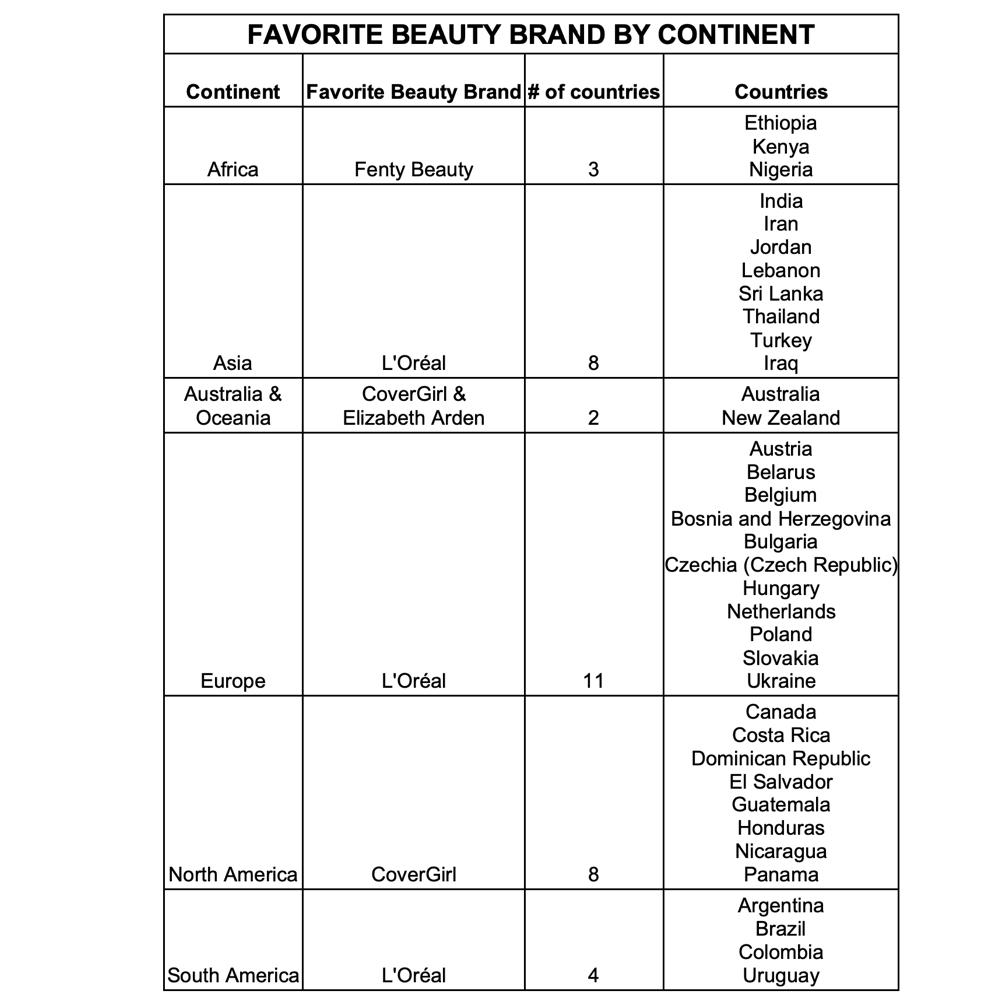 O ranking mostra que, em qualquer região do planeta, o público – com raras exceções – prioriza marcas cujos produtos não sejam excessivamente caros, como é o caso da L’Oréal Paris. Em segundo lugar ficou a marca americana CoverGirl, primeira colocada em dez países espalhados pelo mundo e em dois continentes (América do Norte e Austrália/Oceania). Em seguida, vêm a Maybelline, a NYX Professional Makeup e a Avon, cujos produtos também se situam numa faixa acessível de preços.