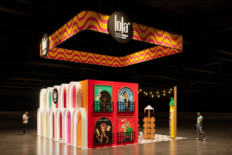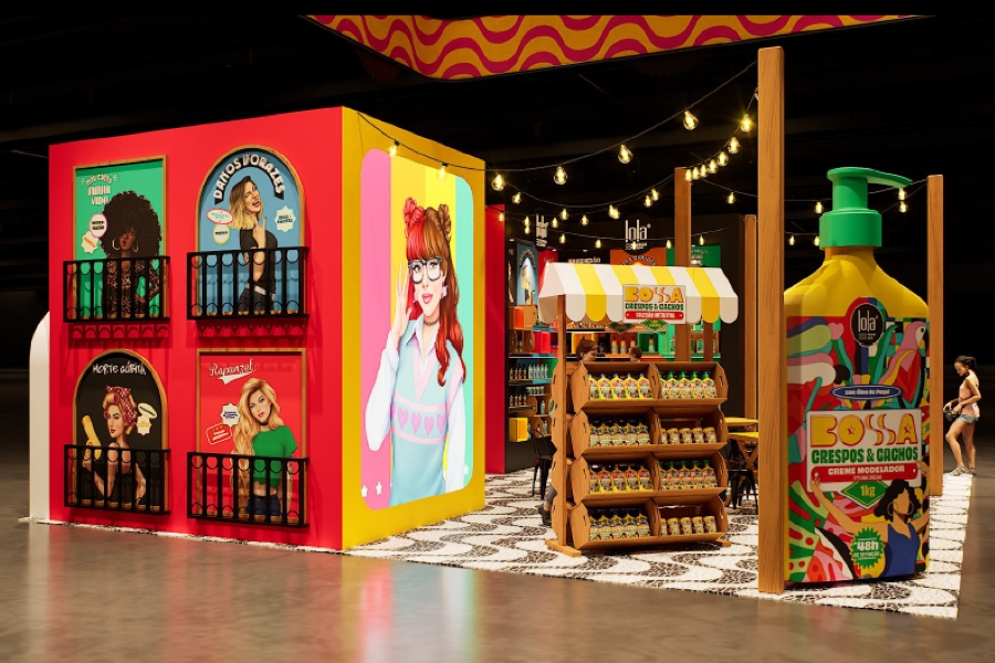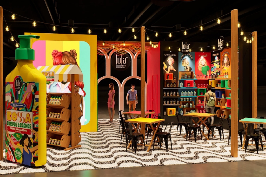 A marca já participou de edições anteriores, mas desta vez assume uma estrutura maior e decidiu fazer o caminho inverso da neutralidade estética comum em feiras internacionais. O estande traz referências diretas ao Rio de Janeiro, com elementos inspirados no calçadão de Copacabana, nos Arcos da Lapa e até nas gambiarras típicas de bares antigos da cidade. A cenografia também dá destaque à linha Bossa, coleção para cacheadas da marca.