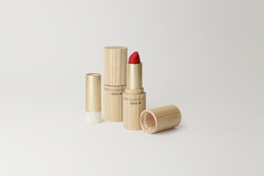 Na categoria maquiagem, a Aptar , em colaboração com a Quadpack, apresentou o Iconic Woodacity, batom recarregável com estojo de madeira.