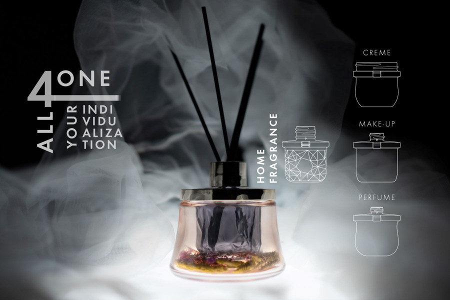 O uso de vidro na embalagem externa ou até no recipiente interno é também a aposta da Heinz Glas, que lançou o conceito All4One, inteiramente realizado com esse material. O pote apresenta quatro insertos intercambiáveis, selecionados em função da aplicação ou da fórmula utilizada (perfume, loção, emulsão ou base facial). O produto está disponível em vidro transparente, PCR, cores ou opala.