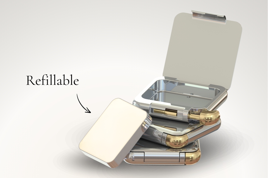 No estande da Metapack, o destaque foram os estojos Timeless: inteiramente em zamac, eles podem ter forma quadrada, redonda ou qualquer outro formato, e são recarregáveis, reutilizáveis e recicláveis indefinidamente. O sistema de trava, cuja patente foi registrada pela empresa, utiliza uma pequena haste para o fecho. O objetivo é evitar a mistura de materiais e, ao mesmo tempo, oferecer uma solução de alto padrão.