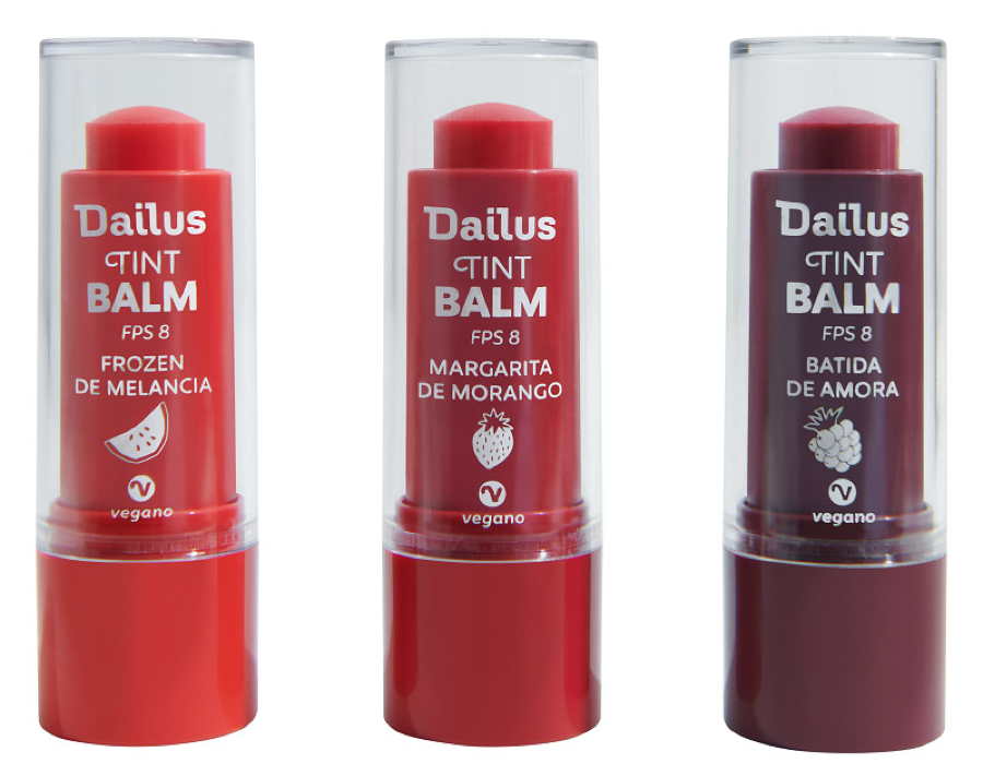 A Dailus, que já tinha uma coleção de lip tints em seu catálogo, lançou em 2021 uma linha de tint balms com FPS 8. “As mulheres querem lábios bonitos e bem cuidados. Nosso Tint Balm foi desenvolvido justamente com essa proposta”, diz Carolina Bertelli, diretora de marketing, P&D e novos negócios da marca. Com fórmula enriquecida por óleo de mamona, cera de candelila e vitamina E, o produto tinge suavemente, hidrata e protege os lábios.