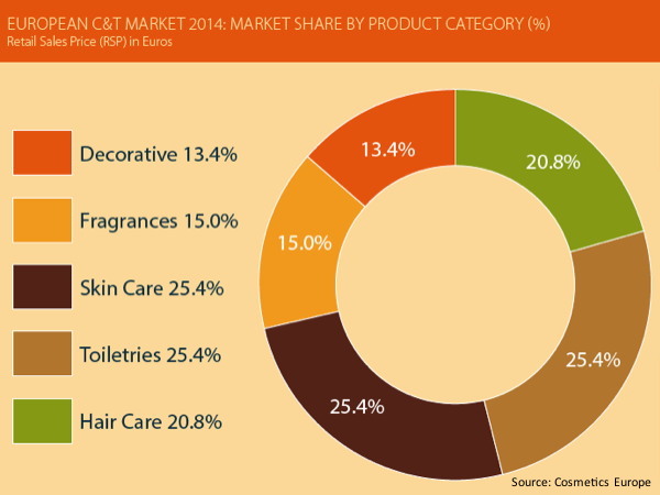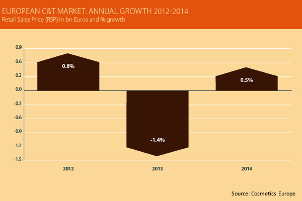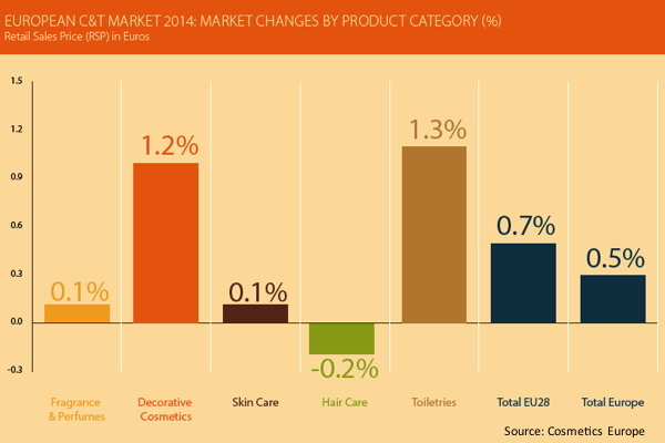 Em 2014, a indústria europeia de cosméticos fez as pazes com o crescimento, registrando +0,5% em termos de valor, segundo dados divulgados pela Cosmetics Europe. A título de comparação, em 2013 foi observada uma queda de 1,4%.