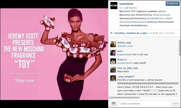 A essência está disponível para venda no site da Moschino. Jeremy Scott estará em Londres na quinta-feira na famosa loja da Brompton Road para comemorar o lançamento do perfume. Há também uma campanha publicitária estrelada por Isabeli Fontana e fotografada por Steven Meisel.