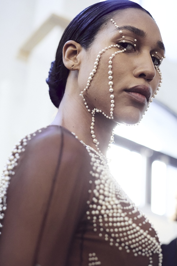 Os olhos receberam um tratamento ousado e harmonioso, coordenado com os vestidos da coleção, utilizando o High-Pigment Longwear Eyeliner. A beleza foi completada com o Afterglow Sensual Shine Lipstick e o Afterglow Lip Shine, destacando os lábios com brilho de alto impacto.