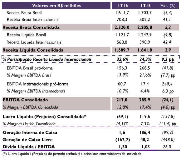 A receita da empresa retraíra no Brasil mas as operações internacionais cresceram 42,4% frente ao ano passado, mantendo resultados vigorosos.