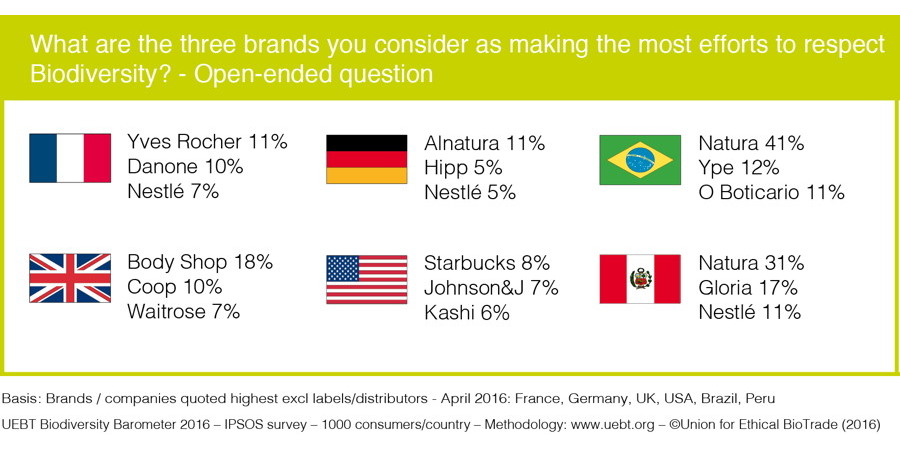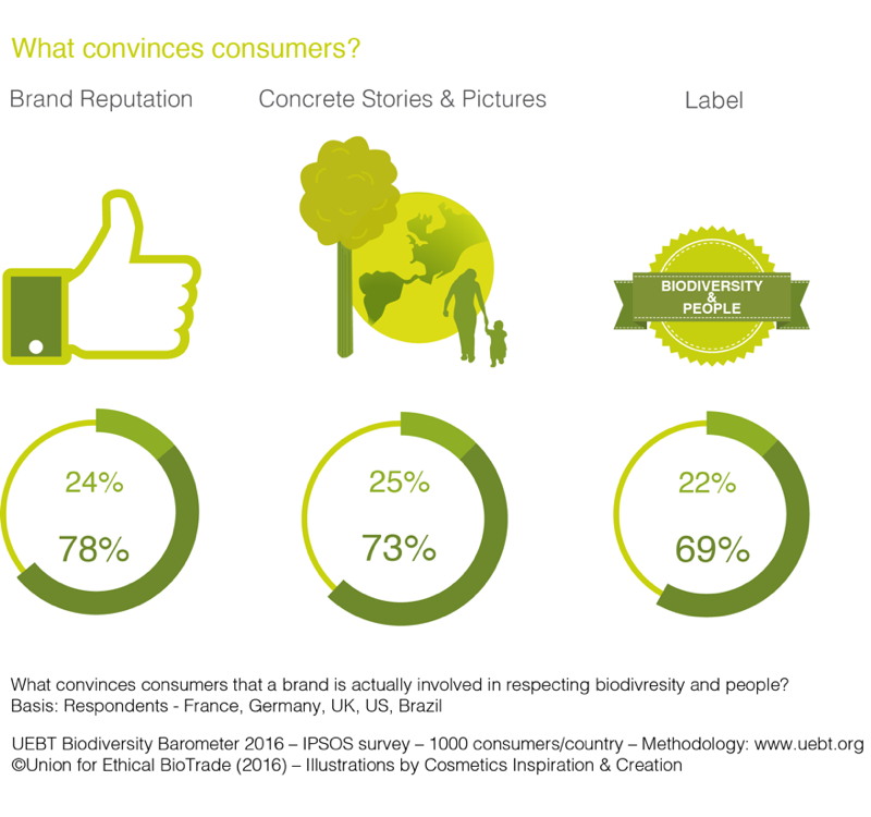 A pesquisa da UEBT mostra que os consumidores gostariam de contribuir para a conservação da biodiversidade, mas a maioria ainda não sabe como fazê-lo. Eles esperam que as empresas respeitem as pessoas e a biodiversidade, mas atualmente estão longe de confiar que as medidas necessárias estão sendo tomadas. Os consumidores querem receber mais informações e poderiam ser convencidos pela reputação de uma marca, bem como por autênticas histórias verificadas externamente.