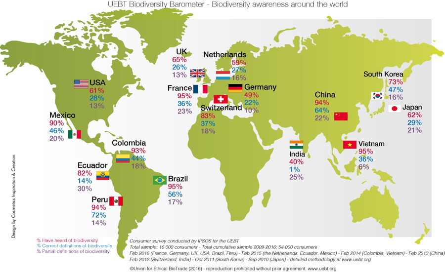 Mais e mais pessoas estão conscientes sobre a biodiversidade. Se informações confiáveis e marcas de respeito estão disponíveis, os consumidores estão dispostos a comprar produtos ‘amigos da biodiversidade’ contribuindo para com a conservação e o uso sustentável da biodiversidade. Isto é o que nos aponta a última versão do Barômetro de Biodiversidade, uma pesquisa realizada anualmente pela União para BioComércio Ético (UEBT), que trata sobre a consciência do consumidor e das empresas líderes do mercado de cosméticos, alimentos e bebidas em relação à biodiversidade, ao redor do mundo. [1]