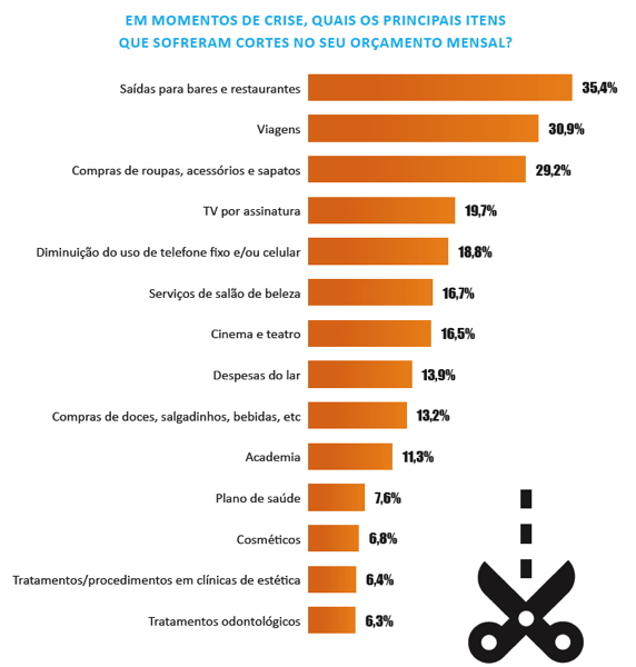 Em decorrência das dificuldades financeiras impostas pela atual conjuntura, os consumidores disseram que os itens que mais sofreram cortes foram as saídas para bares e restaurantes (35,4%) e as viagens (30,9%). Somente em terceiro lugar aparecem as compras de roupas, acessórios e sapatos (29,2%), seguidas por cortes na contratação de TV por assinatura (19,7%) e da diminuição do uso de telefones fixo e celular (18,8%). Cortes com gastos com salão de beleza são apenas a sexta alternativa mais citada, com 16,7% de menções.