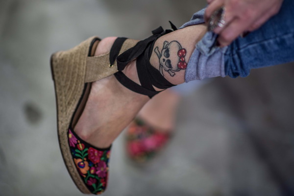 "De qualquer forma, caveiras não precisam ser necessariamente assustadoras", assinala Virla no studio dedicado a mulheres. "Quer ver?", diz ela levantando a barra da calça comprida e mostrando, na perna, uma caveira com um pitoresco laço de bolinhas vermelhas e brancas. "Tudo é questão de perspectiva".
