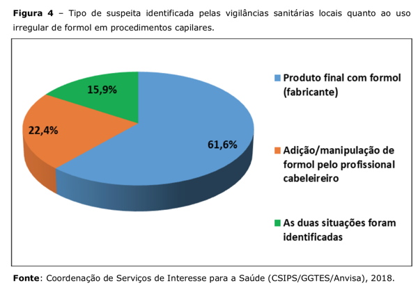 Os formulários encaminhados pelos fiscais sanitários mostram também que, para 22,4% dos que perceberam irregularidades, a adição ou manipulação pode ter sido feita pelo profissional cabeleireiro. Já para 15,9% desses fiscais, as duas situações ocorrem: tanto o produto é fabricado com um teor de formol acima do permitido, como o produto é adicionado ao cosmético.