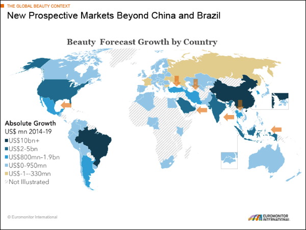 Os mercados asiáticos são o principal terreno de crescimento para os produtos para a pele. Segundo a Euromonitor, até 2019 a Ásia será responsável por 80% do crescimento das vendas mundiais nessa categoria. A China, sozinha, responderá por 75% do crescimento absoluto das vendas no continente. "Devemos também ficar de olho na Indonésia e na Índia, que surgem como as próximas fronteiras de expansão. Até 2019, a Indonésia deverá conquistar um lugar entre os dez principais mercados mundiais de cosméticos para a pele", prevê Irina Barbalova.