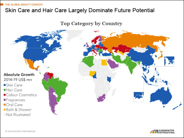 Na maioria dos mercados, o segmento que mais se destaca é o de cosméticos para a pele, cujas vendas mundiais deverão totalizar mais de 130 bilhões de dólares em 2019. "De todas as categorias de produtos de beleza, é nos tratamentos cutâneos que os consumidores continuam investindo mais, com 15 dólares ao ano por pessoa, em comparação com 10 dólares para produtos capilares e 7 dólares para maquiagem", explica Irina Barbalova, Head of Beauty and Personal Care da Euromonitor International. "Até 2019, um terço do faturamento mundial dos produtos de beleza será gerado por tratamentos para a pele, comparado com 23% entre 2009 e 2014".