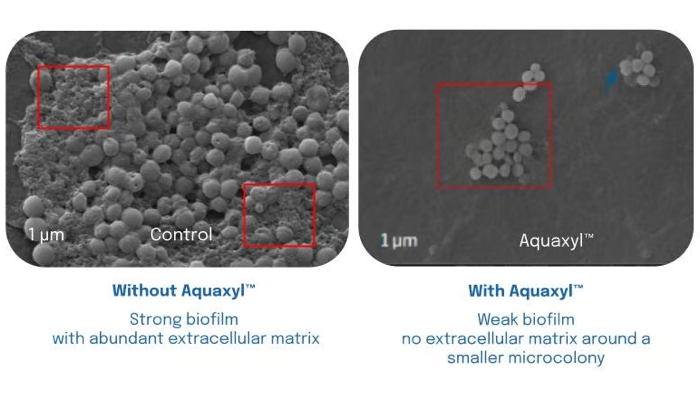 Por outro lado, numa experiência em que foi usada concentração de 3%, o Aquaxyl apresentou ação inibitória contra biofilmes patógenos em um modelo de epiderme humana reconstruída. Concretamente, os dados mostraram uma redução de 59% na formação de biofilmes produzidos por Staphylococcus aureus. "Ao inibir a aderência e a colonização desses micro-organismos oportunistas, o Aquaxyl ajuda a prevenir a disbiose e protege o equilíbrio cutâneo", explica a Seppic.