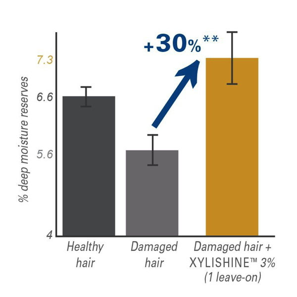 Avaliado em testes ex vivo usando formulação com enxágue ou sem enxágue, o Xylishine a 3% regenera a fibra capilar e restaura a hidratação profunda dos cabelos danificados, penetrando em até 30% a mais no córtex da fibra.
