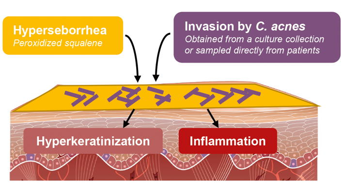 Para chegar a esse resultado, a epiderme reconstruída foi tratada ao mesmo tempo com esqualeno peroxidado e com o filotipo IA1 da bactéria C. acnes disponível em cultura estoque ou diretamente coletado em pacientes acneicos. A combinação desses dois fatores permitiu a indução de respostas queratinocitárias similares à acne, como hiperqueratose e inflamação, possibilitando a obtenção de um modelo com todas as características da pele acneica.