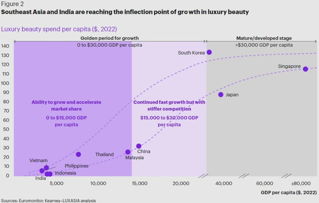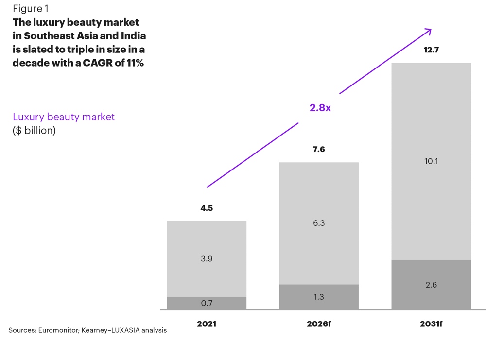 De acordo com um artigo técnico intitulado Unlocking hyper-growth in Asia’s luxury beauty landscape ("Desbloqueando o hipercrescimento no cenário de beleza de luxo da Ásia"), publicado pela empresa de consultoria global Kearney e a Luxasia, um dos principais distribuidores de produtos de beleza de luxo na região Ásia-Pacífico, o Sudeste Asiático (SEA) e a Índia estão prontos para ser a próxima "corrida do ouro" em beleza de luxo, atingindo um potencial de mercado de USD 7,6 bilhões até 2026, com uma taxa de crescimento anual composta (CAGR) projetada de 11% entre 2021 e 2031. [1] Espera-se que esse forte crescimento continue e que o tamanho do mercado quase triplique em 10 anos.