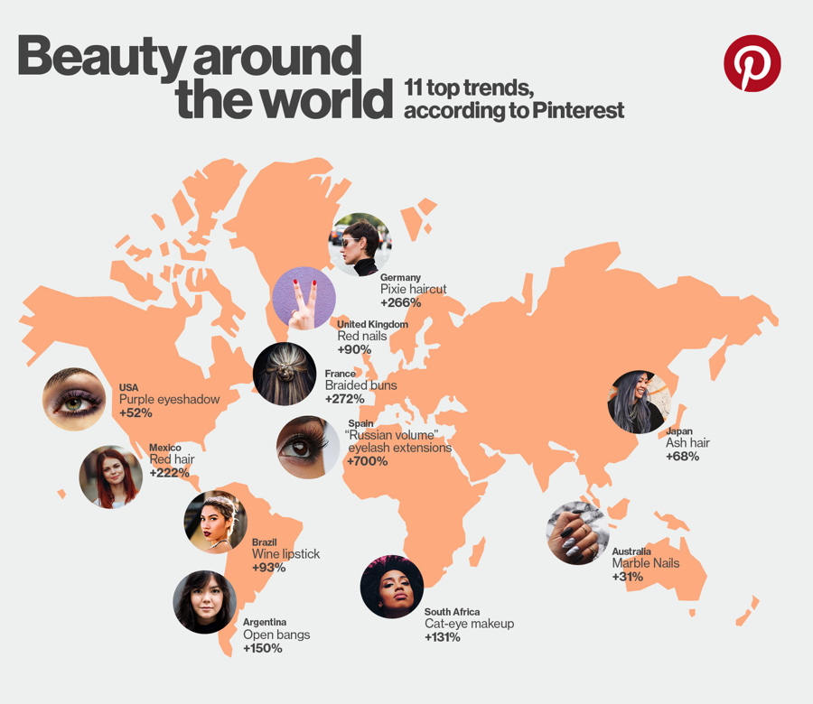 Enquanto isso, os penteados mais simples continuam fazendo sucesso. As buscas por "cascatas de ondas" (cabelos com ondas bem marcadas) aumentaram 133% na Espanha, enquanto as buscas sobre franja deram um salto de 150% na Argentina em apenas um ano. Na Alemanha, os cabelos pixie, bem curtinhos, são alvo de grande interesse por parte das usuárias da rede social, tendo registrado aumento de 266% nas buscas em relação ao ano passado.