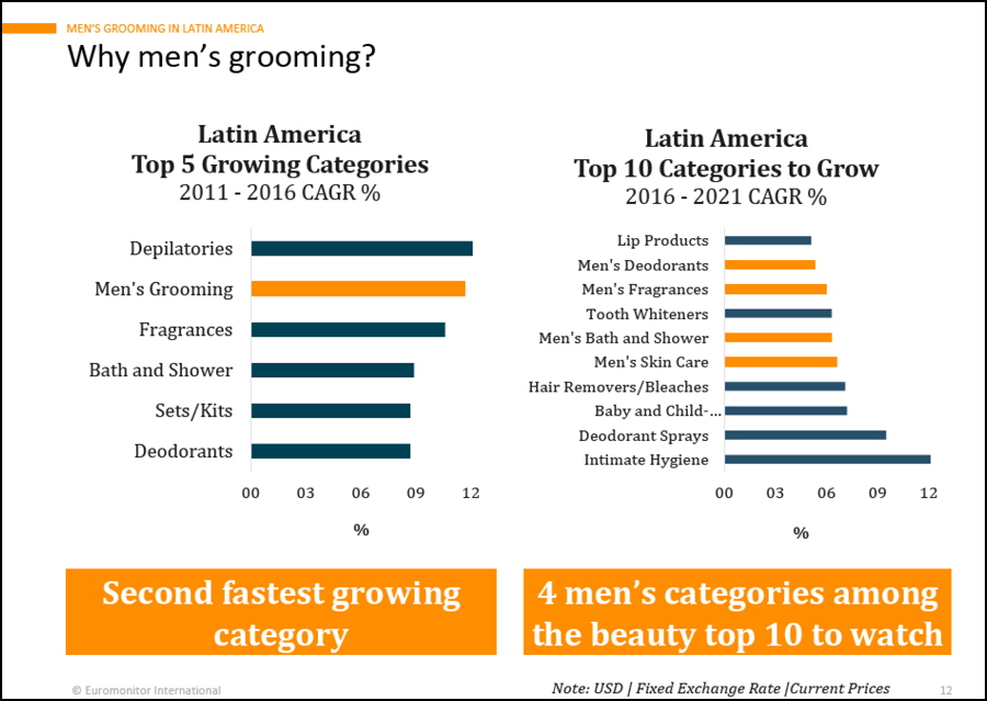 “Men’s grooming vem apresentando um crescimento sustentável na América Latina, sendo a segunda categoria que mais cresceu entre 2011 e 2016. A estratégia de ter uma seção masculina nas lojas vem obtendo sucesso uma vez que oferece aos homens um lugar onde possuem acesso a produtos que atendam todas suas necessidades. Anteriormente, eles precisavam buscar nas prateleiras produtos específicos em meio a outros voltados às mulheres,” comenta Elton Morimitsu, analista sênior da Euromonitor.