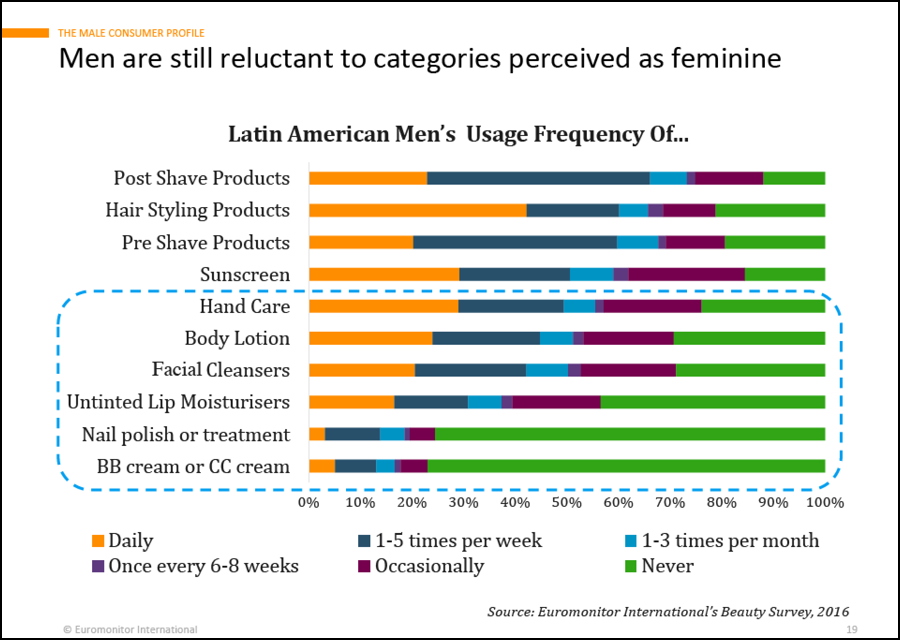 De acordo com o relatório, as vendas de produtos de beleza masculina ainda são dominadas por categorias mais tradicionais, como perfumes, desodorantes e produtos para barbear (que juntas representam 96% do total das vendas). Porém, os latino-americanos estão aos poucos aumentando o consumo de cosméticos.