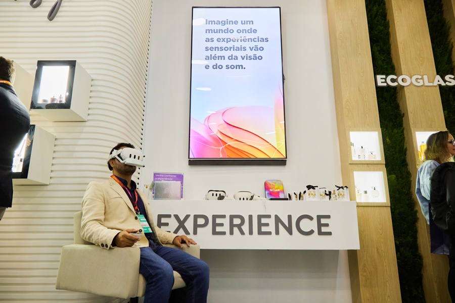 O ponto alto da visita foi a experiência com os óculos 4D desenvolvida pela Noar, startup parceira do grupo Wheaton. Por meio de tecnologia de realidade virtual associada a uma solução de difusão digital de perfumes desenvolvida pela Noar, os participantes tiveram a oportunidade de vivenciar de forma imersiva cada etapa do processo de criação de uma nova embalagem de perfume, desde a concepção até a produção final, proporcionando uma experiência sensorial completa.