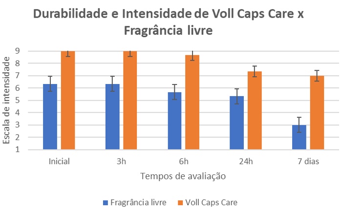 Os resultados atestam que a fragrância tecnológica Voll Caps Care manteve sua intensidade preservada, mesmo após 24h do início do teste. Após 7 dias, ela ainda estava presente e liberou a fragrância contida em seu interior após o rompimento das microcápsulas, demonstrando maior intensidade e durabilidade em relação à fragrância livre.